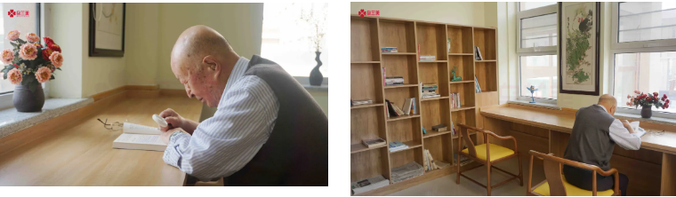 在烏蘭美康養(yǎng)院的圖書室里,人們常常會看到一位老人拿著放大鏡在埋頭讀書,一讀就是2小時。談及爺爺?shù)拈喿x愛好,老人家興奮地說:“我每天早上起來,在康養(yǎng)院內(nèi)散散步。九點左右就去康復(fù)訓(xùn)練室里用按摩椅活動活動筋骨,九點半左右我就去圖書室了,一般看兩小時的書。每天中午和晚上睡覺前,我是一定要看一小時書的,這已經(jīng)成為了生活‘必需品’。”不少人感嘆王爺爺?shù)淖月桑麉s打趣道:“我也是勞逸結(jié)合!午睡后,我會到活動室打兩小時的麻將。”